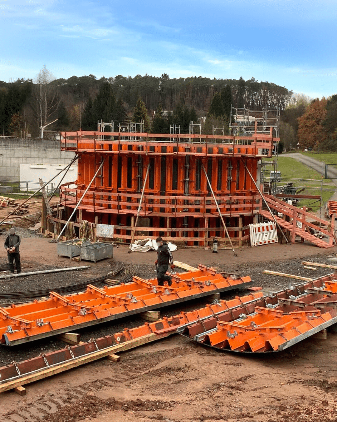 Auf der Kläranlage in Dahn erbaute Wolf & Sofsky ein Schlammsilo zur Zwischenlagerung und Entwässerung des Klärschlamms. Die 9,00 m hohen Wände des Rundbeckens wurden mithilfe der von uns bereitgestellten TTK Trapezträger-Rundschalung realisiert. Durch das werkseitige Runden und Aufstocken der Segmente konnte ein effizienter Schalungsaufbau garantiert werden. Die sehr hohe Steifigkeit der 9,00 m hohen Segmente ermöglichte die Erstellung einer maßgenauen Betonoberfläche, wobei kein Nachjustieren erforderlich war. Wir freuen uns, in Zusammenarbeit mit Wolf & Sofsky am Bau des Schlammsilos mitgewirkt zu haben.